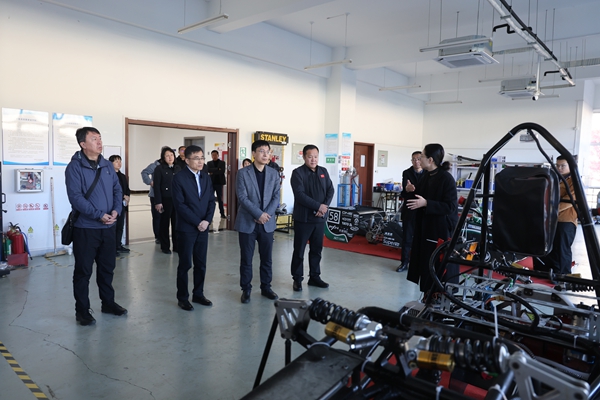 在校期间,杨敬民一行观看了学校宣传片,参观了金石滩校区沙盘以及机电工程学院“民族之魂”方程式赛车队、工程教育中心、智能制造现代产业学院。