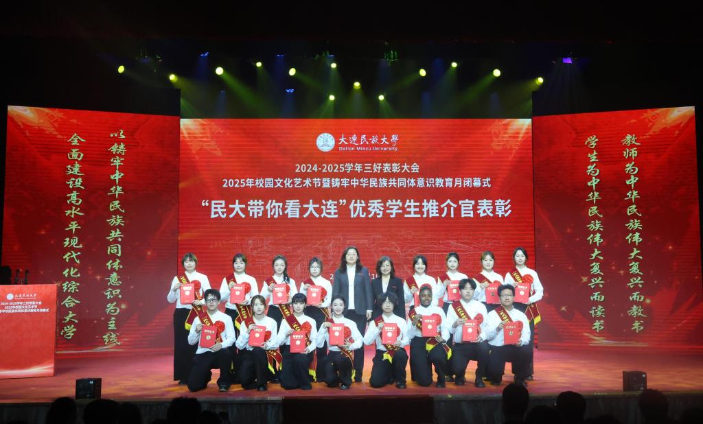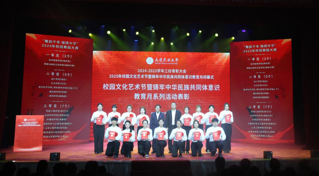 2025年校园文化艺术节暨铸牢中华民族共同体意识教育月在辽宁省委宣传部、省委教育工委和大连市委宣传部、市委教育工委指导支持下,累计开展21项校级活动、15项院级活动和37项社团活动,打造了“各族学子看大连”、“一帮一”互助学习小组评比等特色活动,吸引近8万人次参与,有效推动了校园文化建设与“铸牢”教育深度融合。闭幕式现场通过视频短片和师生代表发言,集中展示了2024—2025学年涌现出的学生先进集体和个人,总结和表彰了校园文化艺术节暨“铸牢”教育月活动。与会领导和教师、校友为获奖集体和个人代表颁奖。