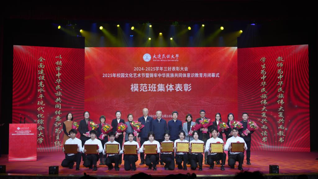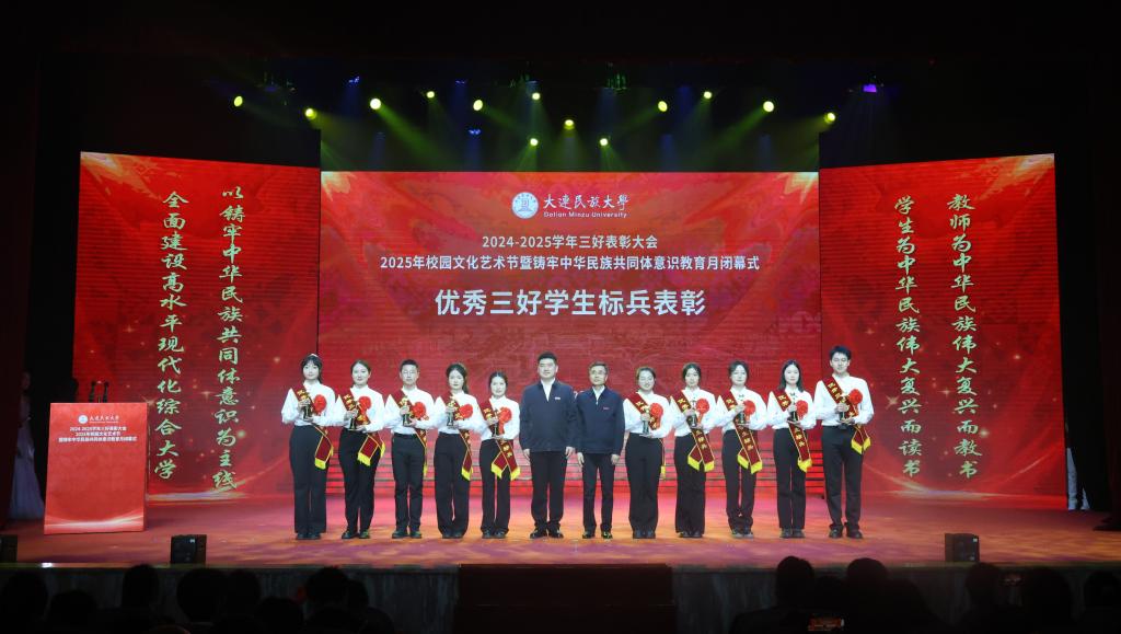 民大新闻网讯  12月10日,学校举行2024—2025学年三好表彰大会、2025年校园文化艺术节暨铸牢中华民族共同体意识教育月闭幕式。辽宁省委宣传部副部长兼省电影局局长杨利景,大连市委常委、宣传部部长,市委教育工委书记郭铁钧出席活动并向受表彰的学生集体颁奖。学校党委书记赵铸,党委副书记、校长赵立涛出席活动并与国家奖学金获得者合影留念。