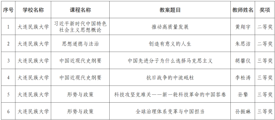 民大新闻网讯 近日,辽宁省教育厅正式发布《关于公布2025年辽宁省高校思想政治理论课精品教案成果认定的通知》,我校马克思主义学院教师黄翔宇、朱思洁获得二等奖,胡馨仪、李松涛、孙擎、孙振琳等四位教师获得三等奖。本次全省高校思想政治理论课精品教案成果认定工作,是辽宁省教育厅落实《以“四个一批”为抓手推进高校思政课建设工作方案》的重要举措,旨在推动各高校深入学习领会习近平总书记关于学校思政课建设的系列重要讲话和指示批示精神,切实贯彻落实党中央决策部署及省委工作要求,全面提升全省高校思想政治理论课教学质量与水平。