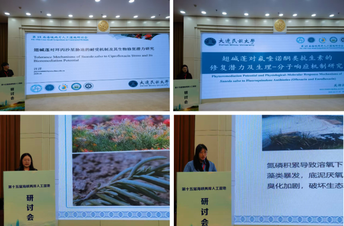 会议上崔玉波教授作了题目为《污泥处理湿地去除抗生素的效能与分子生物学机制》的大会报告,同时崔教授也受邀主持分会场学术报告,共同和与会者就分会场报告内容展开学术研讨。参加会议的研究生也针对自己的研究内容分别作了《翅碱蓬对环丙沙星胁迫的耐受机制及其生物修复潜力研究》《翅碱蓬对氟喹诺酮类抗生素的修复潜力及生理-分子响应机制研究》《翅碱蓬的生理代谢适应机制研究》《翅碱蓬生物修复的分子生物学机制》的学术报告,汇报团队在人工湿地植物修复领域的最新研究进展。通过此次会议,充分展示了我院在生态环境领域,特别是人工湿地技术研究与应用方面学术实力和影响力,对两岸学术交流与合作起到积极的推动作用。