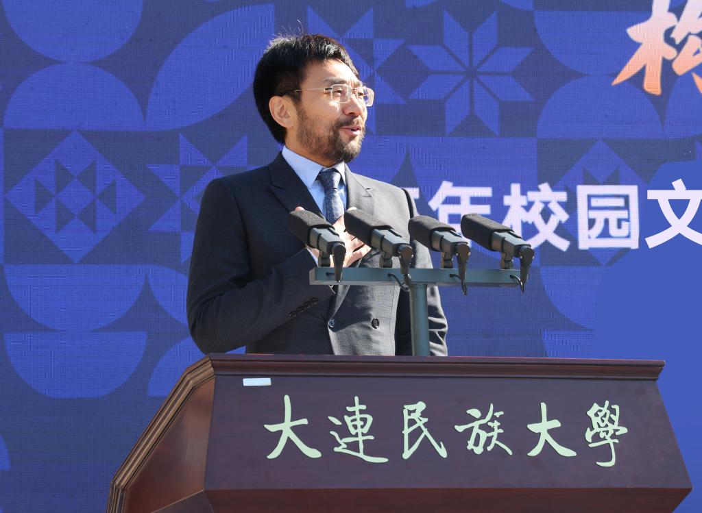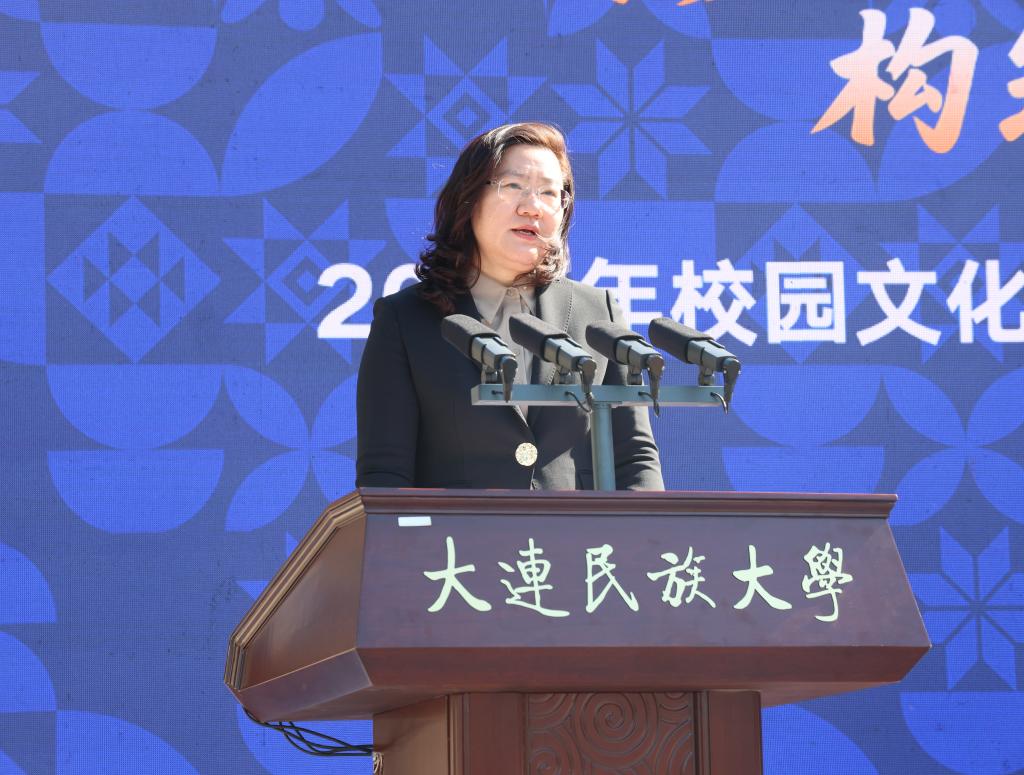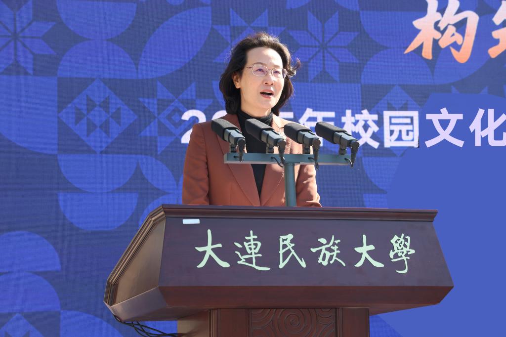 柳金红在致辞中表示,大连民族大学坚持以铸牢中华民族共同体意识为主线,将教育、科技、人才等资源优势与大连振兴发展紧密结合,积极深化校地合作,精心承办相关活动,为大连市加快“两先区”高质量发展提振了更大声量。希望学校围绕培养具有民族团结基因和中华民族共同体意识的优秀人才目标,以此次校园文化艺术节为契机,以丰富多彩的校园文化活动为载体,不断加强美育浸润,让铸牢中华民族共同体意识教育更接地气、更聚人心,以更多优质成果助力大连“两先区”“三个中心”高质量发展提质升级。期待广大青年学子不断提升综合素质,增强文化自信心和民族自豪感,为城市发展注入青春力量,更好肩负起民族复兴的时代重任。