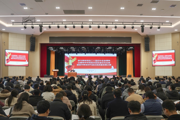 赵铸以“学习贯彻党的二十届四中全会精神 以铸牢中华民族共同体意识为主线 坚定不移走好内涵式高质量发展之路”为题,围绕学习贯彻习近平总书记在党的二十届四中全会上的重要讲话精神和全会审议通过的《中共中央关于制定国民经济和社会发展第十五个五年规划的建议》,对照上级要求重点宣讲了全会精神,对“十四五”时期我国经济社会发展取得的重大成就进行了深入解读,同时也总结了“十四五”时期学校改革发展取得的重要突破,结合持续全面落实学校第二次党代会精神,深入分析和准确把握“十五五”时期学校内涵式高质量发展的形势要求和使命任务。