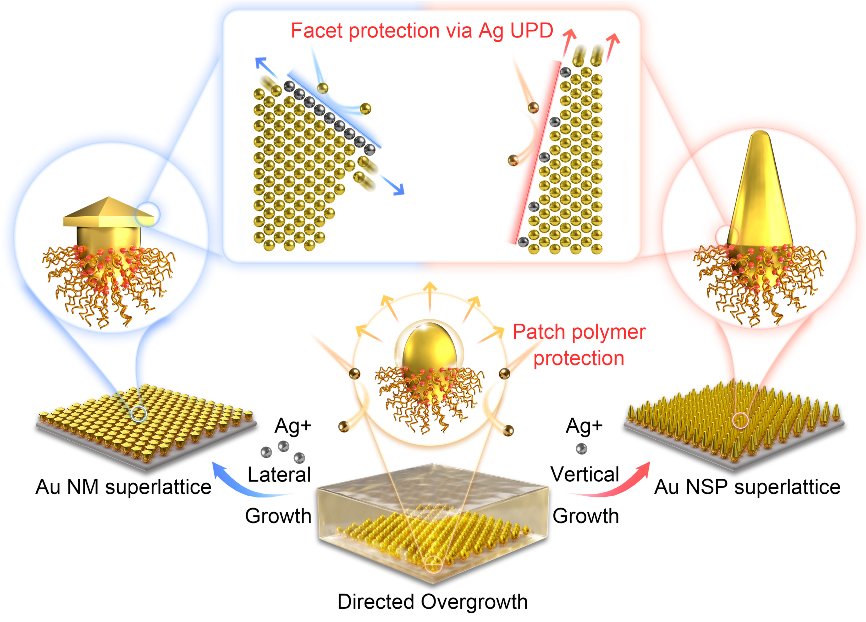 在人工微纳结构光场调控领域,构建有序且定向的非对称等离激元纳米结构阵列在激发集体等离激元响应、增强局域光场强度以及高性能传感方面具有重要价值。然而,由于非对称结构形貌普遍存在不规则性,加之组装过程中颗粒间的相互作用极为复杂,使得这类阵列的制备仍面临巨大挑战。为此,我校物理与材料工程学院研究团队与浙江大学合作,提出一种先组装对称纳米颗粒超晶格、再通过配体保护的选择性生长策略,在纳米尺度上实现了对非对称纳米晶阵列形貌演化的精准控制,从而有效调控其光场分布。基于这一策略,成功制备了两种不同类型的非对称超晶格,即金纳米蘑菇和金纳米单锥超晶格。其中,具有约3nm颗粒间间隙的金纳米蘑菇超晶格表现出最强的拉曼散射增强效应,增强因子最高可达109。该优异性能源于纳米蘑菇结构高曲率“帽沿”处产生的“避雷针效应”与相邻颗粒间超窄间隙所产生的“近场耦合效应”的协同贡献,二者共同作用显著增强了局域光场,提升了表面增强拉曼散射传感的灵敏度。