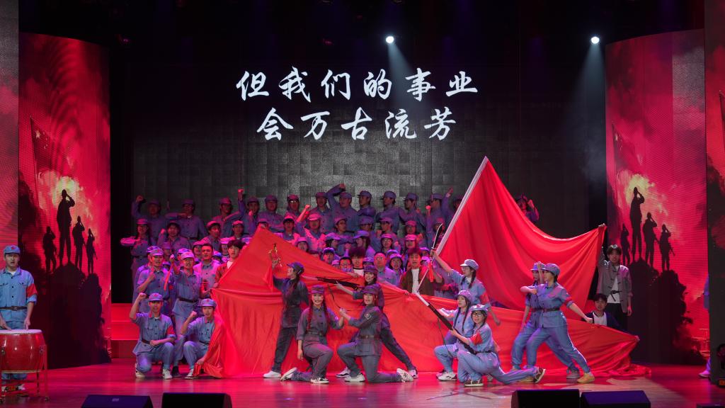 活动在学生工作者共同演绎的《没有共产党就没有新中国》中拉开帷幕。第一篇章《青春向党铸初心》中,师生们通过演绎《游击队之歌》《黄河组曲》《我们走在大路上》《弹起我心爱的土琵琶》《唱支山歌给党听》等经典歌曲,生动讲述了中华民族从1949年到1978年“站起来”的峥嵘岁月,在歌声中回望中国共产党团结带领人民英勇奋斗、改天换地的光辉历程。