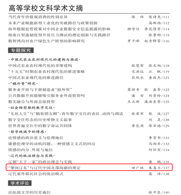 民大新闻网讯 日前,我校中华民族共同体研究院特聘教授田广林作为第一作者在《陕西师范大学学报(哲学社会科学版)》(CSSCI来源期刊)2025年第4期上发表的学术论文《“肇国辽东”与辽代中国北部海疆的奠定》,被《新华文摘》2025年第20期全文转载,被《高等学校文科学术文摘》2025年第10期转载。