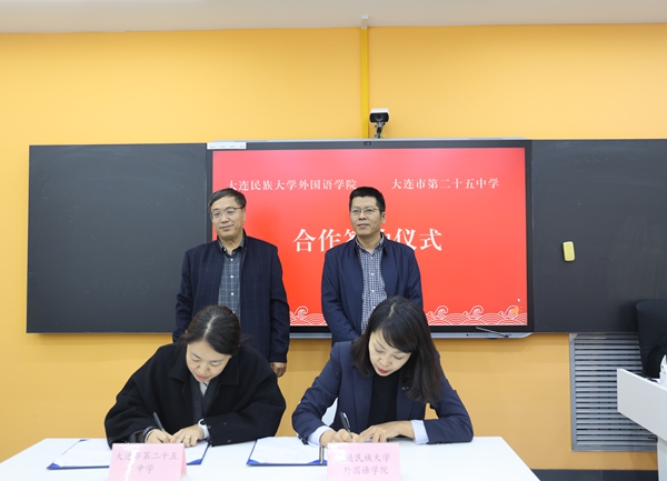 外国语学院院长闫怡恂与大连市第二十五中学党总支副书记、副校长王娇代表双方签署合作协议。根据协议,两校将在教育资源共享、人才培养贯通、文化育人协同等领域开展合作,共同助力大中小学思政教育一体化建设落地见效。