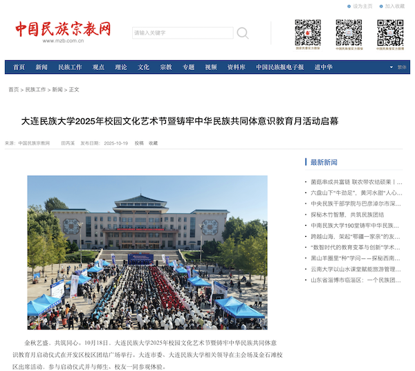 金秋艺盛,共筑同心。10月18日,大连民族大学2025年校园文化艺术节暨铸牢中华民族共同体意识教育月启动仪式在开发区校区团结广场举行。大连市委、大连民族大学相关领导在主会场及金石滩校区出席活动,参与启动仪式并与师生、校友一同参观体验。