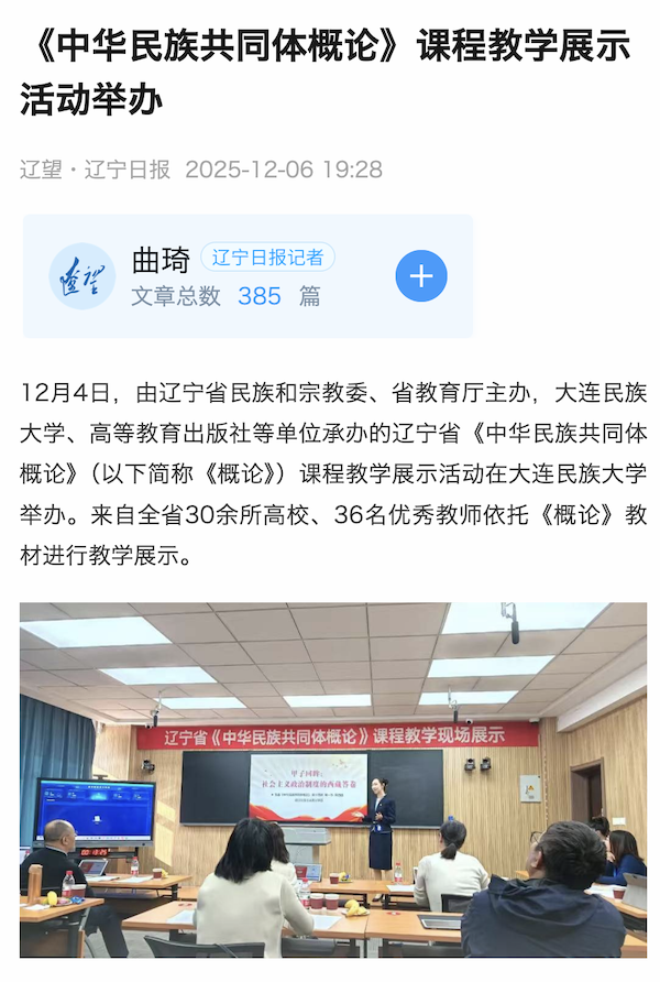 12月4日,由辽宁省民族和宗教委、省教育厅主办,大连民族大学、高等教育出版社等单位承办的辽宁省《中华民族共同体概论》(以下简称《概论》)课程教学展示活动在大连民族大学举办。来自全省30余所高校、36名优秀教师依托《概论》教材进行教学展示。