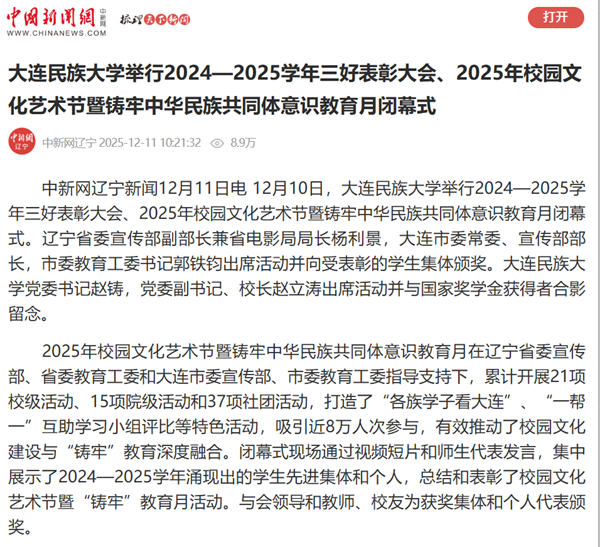 据了解,作为全国唯一连续四次获评“全国民族团结进步模范集体”的高校,大连民族大学始终将铸牢中华民族共同体意识贯穿育人全过程。近年来,学校持续深化“三全育人”,构建“大思政课”育人格局,打造全方位嵌入式育人模式,深入推进各民族师生交往交流交融,着力培养具有民族团结基因和中华民族共同体意识的优秀人才。