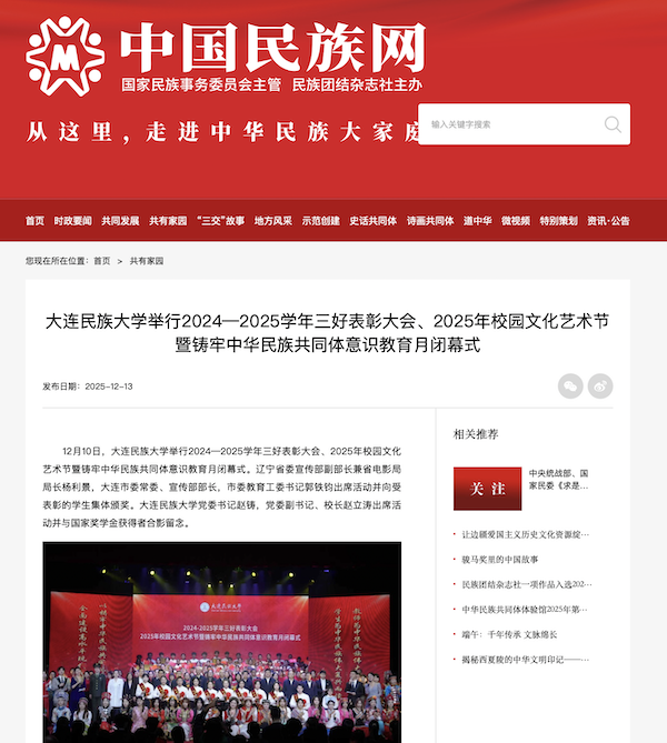 2025年校园文化艺术节暨铸牢中华民族共同体意识教育月在辽宁省委宣传部、省委教育工委和大连市委宣传部、市委教育工委指导支持下,累计开展21项校级活动、15项院级活动和37项社团活动,打造了“各族学子看大连”“一帮一”互助学习小组评比等特色活动,吸引近8万人次参与,有效推动了校园文化建设与“铸牢”教育深度融合。