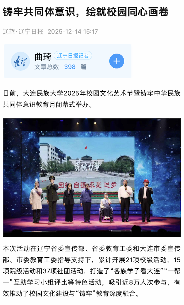 据了解,作为全国唯一连续四次获评“全国民族团结进步模范集体”的高校,大连民族大学始终将铸牢中华民族共同体意识贯穿育人全过程。近年来,学校持续深化“三全育人”,构建“大思政课”育人格局,打造全方位嵌入式育人模式,深入推进各民族师生交往交流交融,着力培养具有民族团结基因和中华民族共同体意识的优秀人才。
