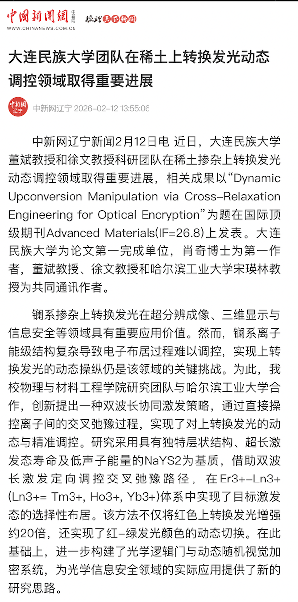 中新网辽宁新闻2月12日电 近日,大连民族大学董斌教授和徐文教授科研团队在稀土掺杂上转换发光动态调控领域取得重要进展,相关成果以“Dynamic Upconversion Manipulation via Cross-Relaxation Engineering for Optical Encryption”为题在国际顶级期刊Advanced Materials(IF=26.8)上发表。大连民族大学为论文第一完成单位,肖奇博士为第一作者,董斌教授、徐文教授和哈尔滨工业大学宋瑛林教授为共同通讯作者。