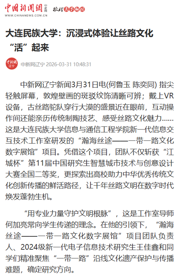 中新网辽宁新闻3月31日电(何鲁玉 陈奕同) 指尖轻触屏幕,敦煌壁画的斑驳纹饰清晰可辨;戴上VR设备,古丝路驼队穿行大漠的盛景近在眼前,互动操作间还能亲历传统制陶技艺、感受丝路文化魅力……这是大连民族大学信息与通信工程学院新一代信息交互技术工作室研发的“瀚海丝途——一带一路文化数字展馆”项目。凭借这个项目,团队不仅斩获“江城杯”第11届中国研究生智慧城市技术与创意设计大赛全国二等奖,更探索出高校助力中华优秀传统文化创新传播的鲜活路径,让千年丝路文明在数字时代焕发蓬勃生机。