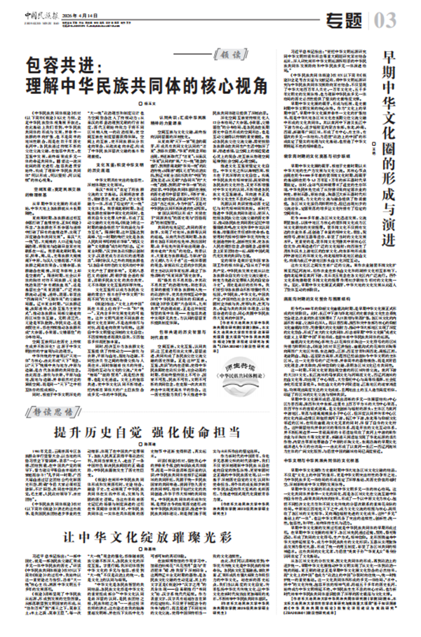 4月14日,《中国民族报》教育版整版报道我校师生共读《中华民族共同体概论》,内容包括杨玉文教授的《包容共进:理解中华民族共同体的核心视角》、王艳副教授的《早期中华文化圈的形成与演进》,以及中华民族共同体学院2023级民族学硕士研究生陈雨迪的《提升历史自觉 强化使命担当》、2025级民族学硕士研究生陈嘉楠的《让中华文化绽放璀璨光彩》。