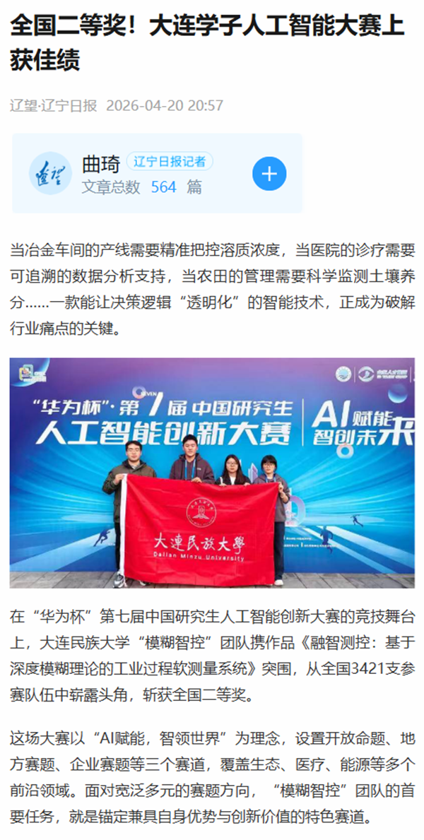 在“华为杯”第七届中国研究生人工智能创新大赛的竞技舞台上,大连民族大学“模糊智控”团队携作品《融智测控:基于深度模糊理论的工业过程软测量系统》突围,从全国3421支参赛队伍中崭露头角,斩获全国二等奖。