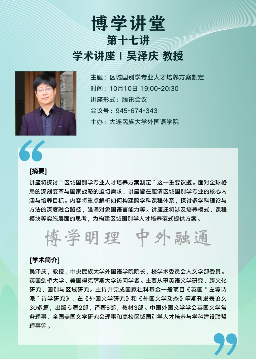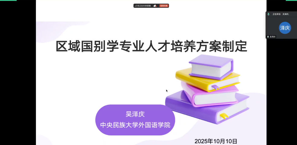 10月10日,外国语学院开展了“区域国别学专业人才培养方案制定”线上专题讲座,本次讲座由中央民族大学外国语学院院长、校学术委员会人文学部委员吴泽庆教授讲授,闫怡恂院长主持。